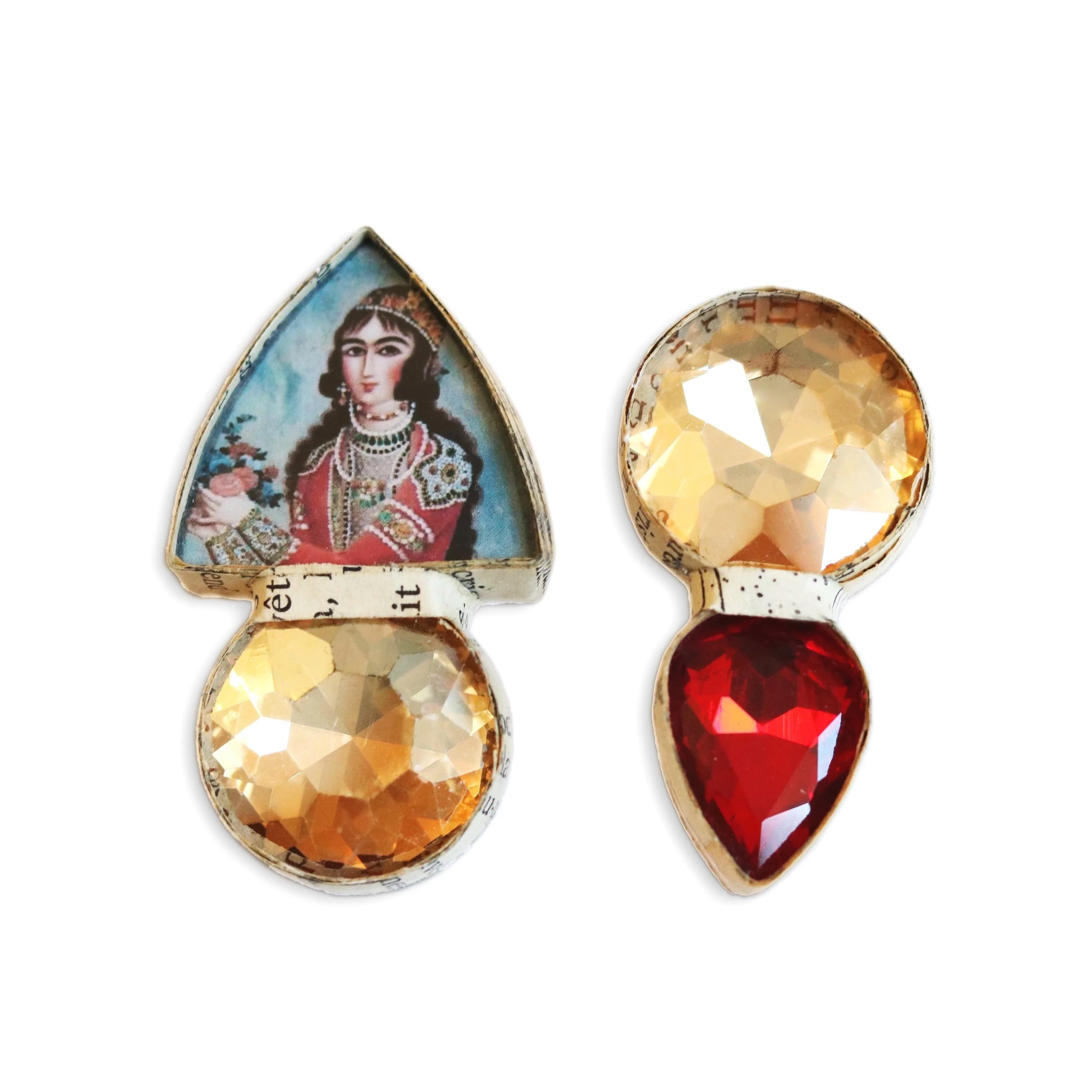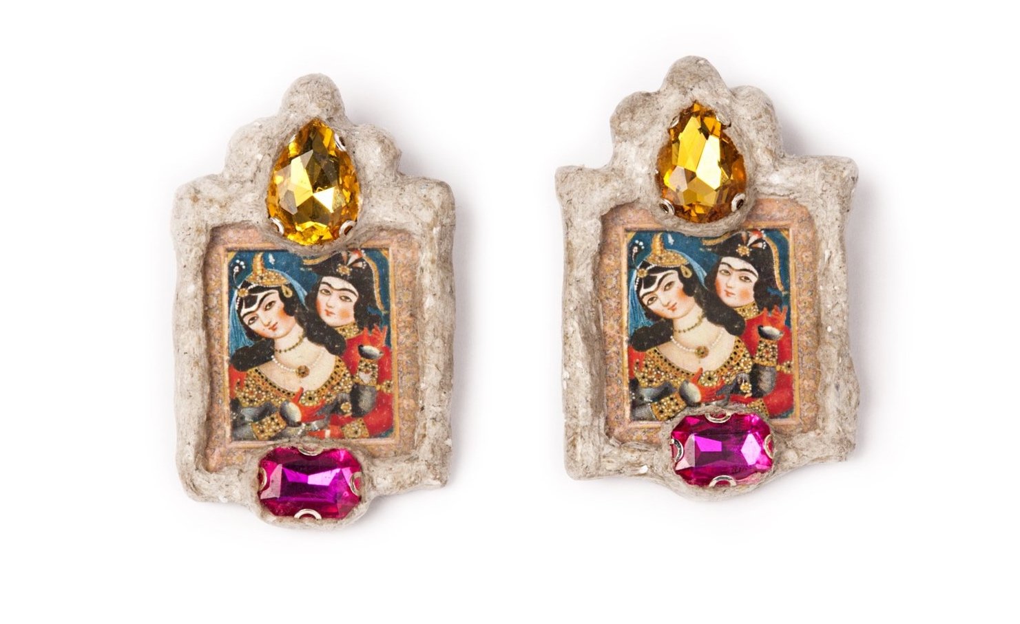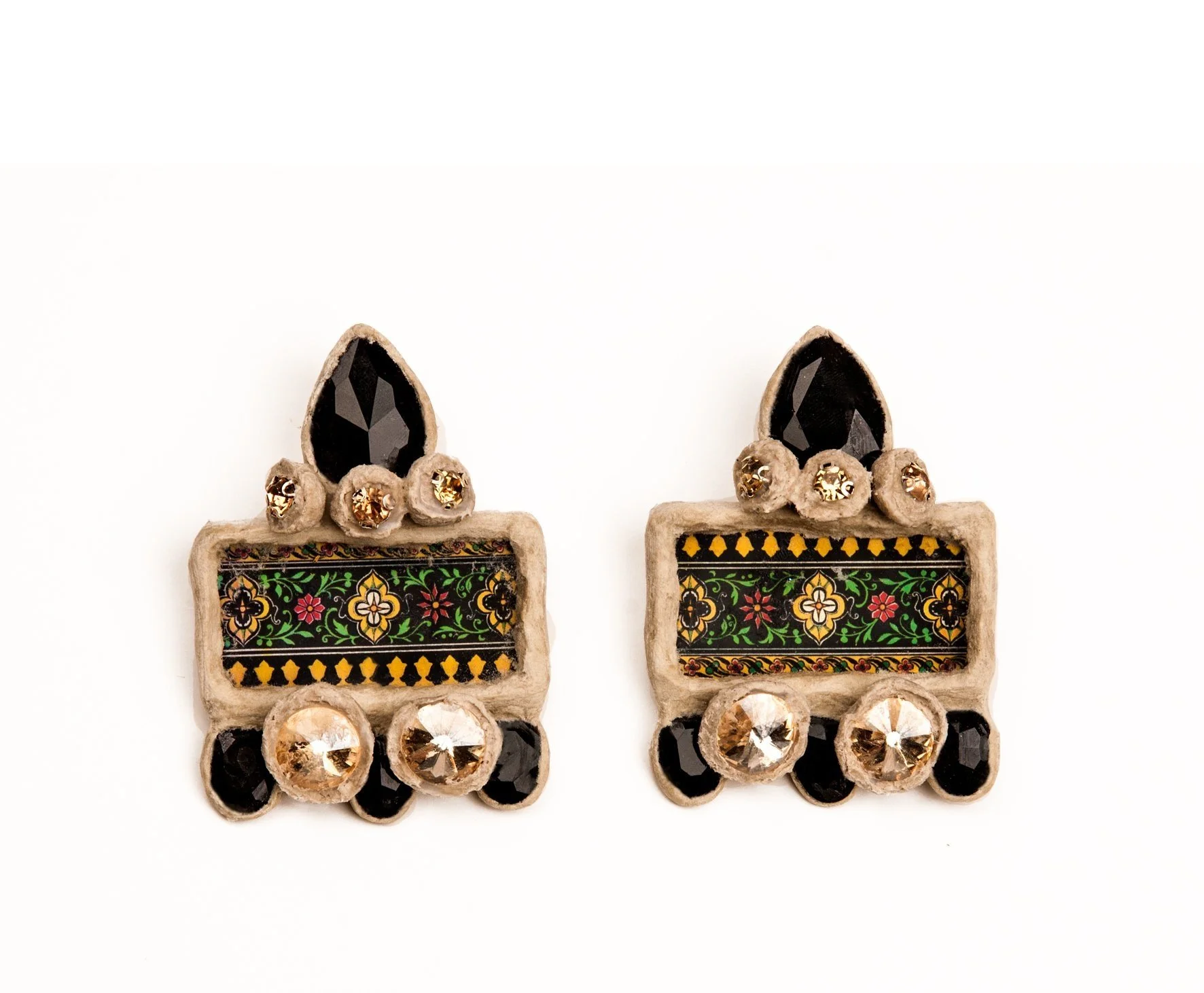 These lightweight paper mache earrings feature intricate Qajar-style designs and vibrant colors. The unique texture and traditional Iranian patterns, accented with delicate beads, make them a bold statement piece that adds an elegant touch to any outfit.
